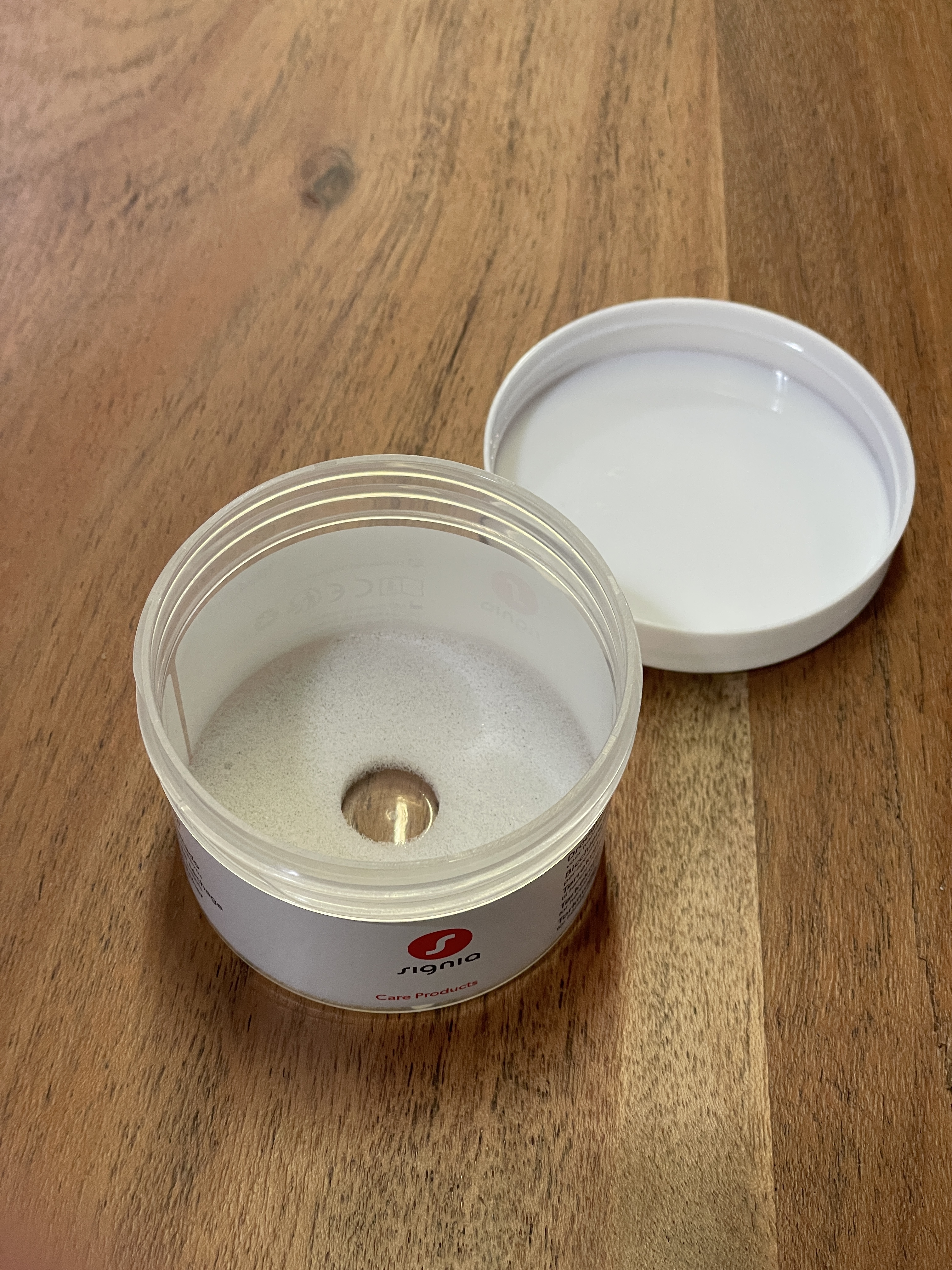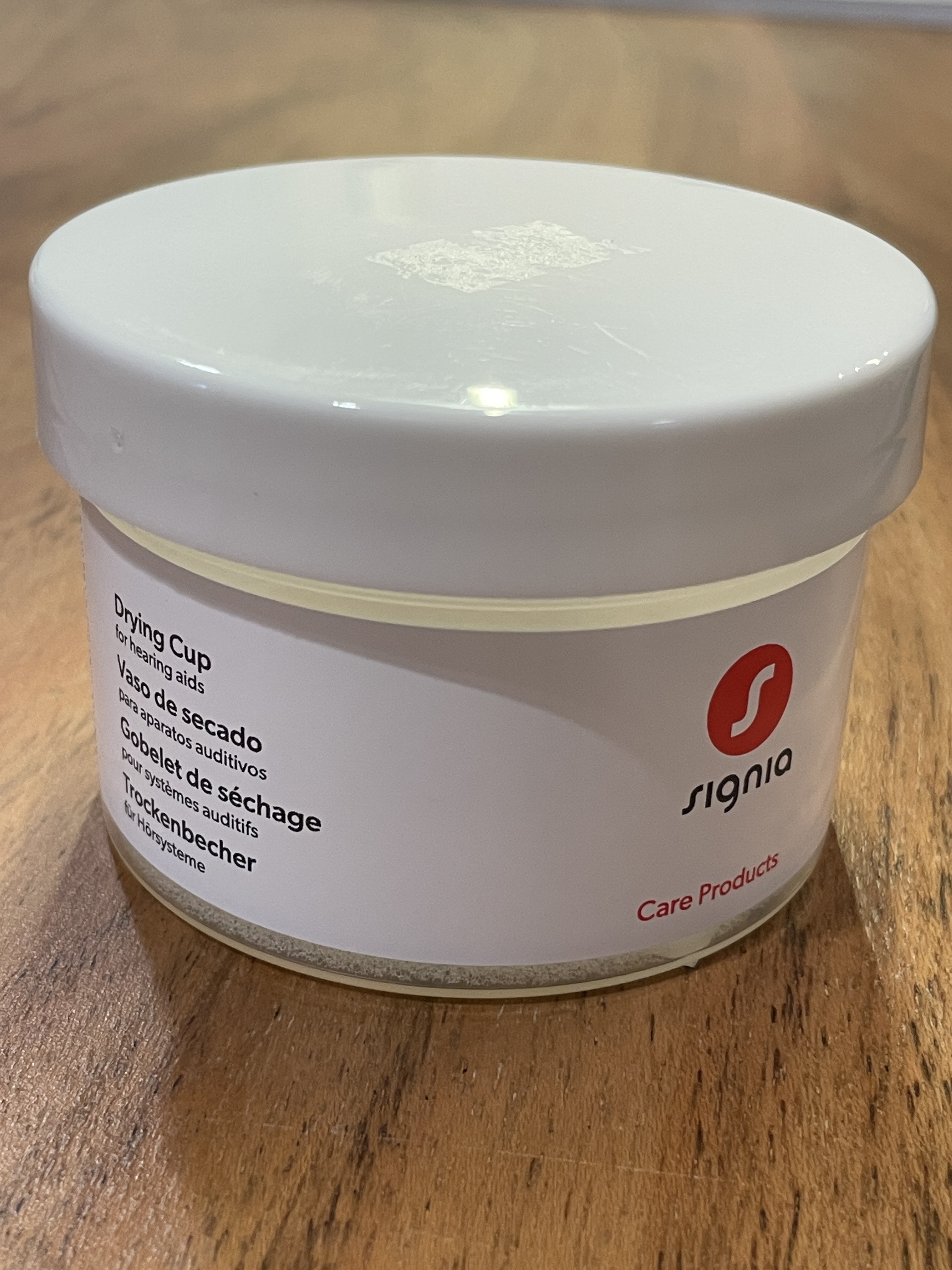 Legen Sie eine Trockenkapsel in den Becher. Dann legen Sie Ihre Hörgeräte hinein und verschließend den Becher. Über Nacht wird die Feuchtigkeit aus den Hörgeräten gezogen.
